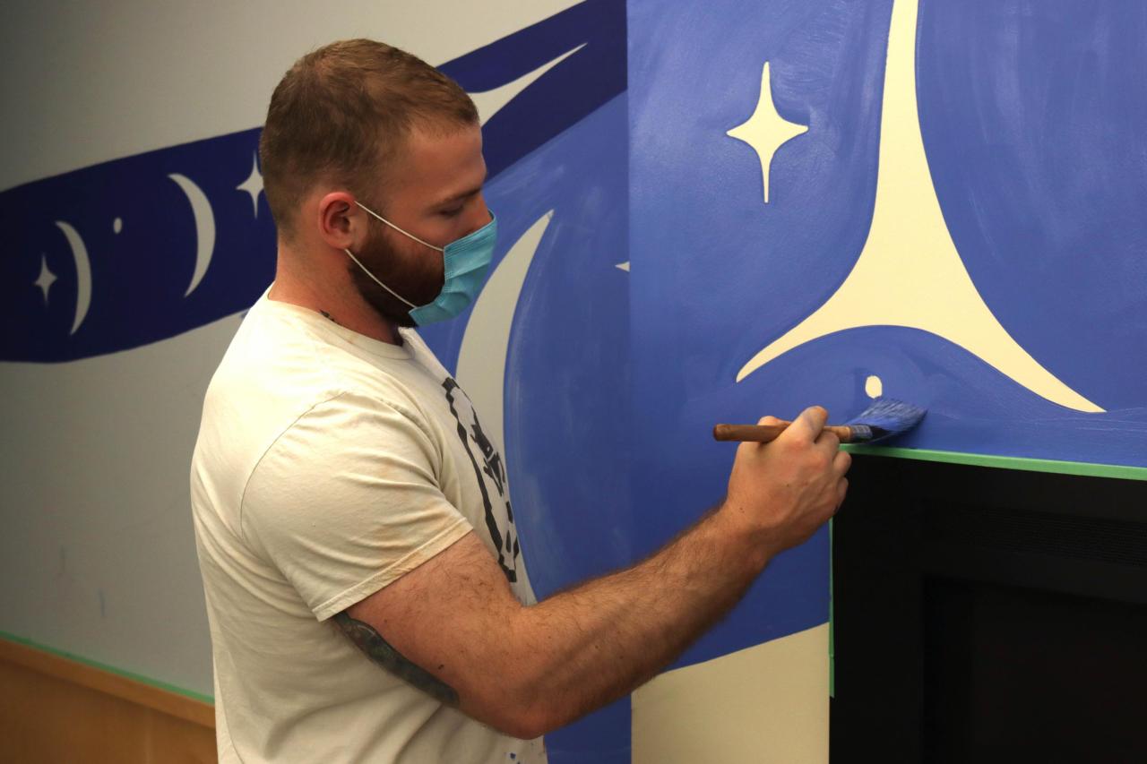 So far, White-Hill has been commissioned by the City of Nanaimo to create an installation at Beban Park Pool, exhibited at a recent Nanaimo Art Gallery show and had his first solo show last fall at White Rabbit Coffee Co. His latest project is a set of murals on the third floor of VIU’s Nanaimo campus library – one in a new family area that was recently constructed and one in the 24-hour library commons area. He was named Emerging Cultural Leader in the City of Nanaimo’s 2021 Culture and Heritage Awards and recently received a YVR Art Foundation Emerging Artist Scholarship to help him pursue a Master of Fine Arts at Emily Carr University of Art + Design starting this fall.