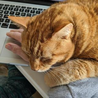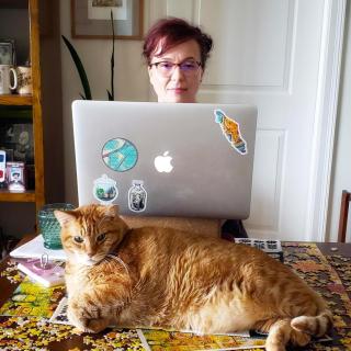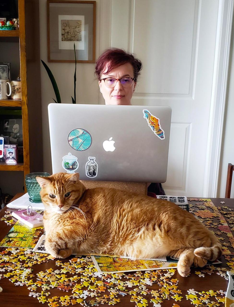 I cycle through the different rooms, using yoga props to create a work surface, pictured here with the support of our cat Rupert.