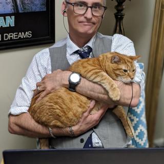 Fred has created an office in our den – creatively using cardboard boxes as a makeshift desk, pictured here with the support of our cat Rupert.